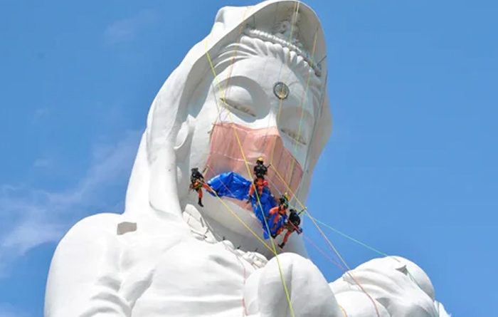 இந்த நிலையில், ஜப்பானில் உள்ள பௌத்த பெண் கடவுளான கண்ணோனின் பிரம்மாண்ட சிலைக்கு முகக்கவசம் அணிவிக்கப்பட்டது., 57 மீட்டர் உயரமுள்ள (187 அடி) இந்த சிலைக்கு, இளஞ்சிவப்பு துணியால் செய்யப்பட்ட 5.3 மீட்டர் அளவில் 35 கிலோ எடை கொண்ட முகக்கவசம் சிலைக்கு அணிவிக்கப்பட்டது. சிலைக்கு முகக்கவசம் அணிவிக்கும் பணியில், 4 தொழிலாளர்கள் 3 மணி நேரத்தில் சிலையின் முகத்தின்கீழ் பாகத்தில் முகக்கவசத்தை அணிவித்தனர்.