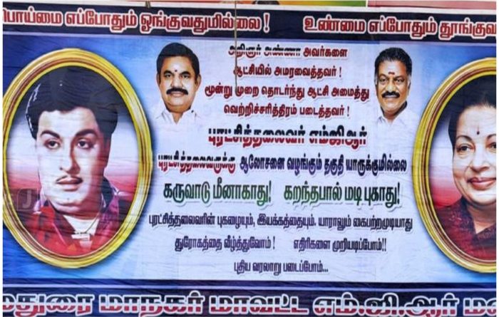 மேலும் கருவாடு மீனாகாது; கறந்த பால் மடி புகாது. புரட்சி தலைவரின் புகழையும் இயக்கத்தையும் யாராலும் கைப்பற்ற முடியாது. துரோகத்தை வீழ்த்துவோம். எதிரிகளை முறியடித்து புதிய வரலாறு படைப்போம் என அந்த போஸ்டரில் வாசகங்கள் இடம் பெற்றுள்ளன.