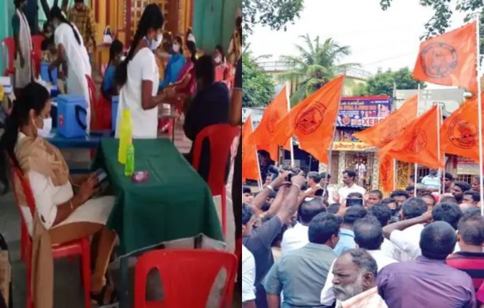 அந்த வகையில் வேலூர் மாவட்டம், சென்னை – பெங்களூரு தேசிய நெடுஞ்சாலையோரம் அமைந்துள்ள பொய்கை கிராமத்தின் முத்தாலம்மன் கோயிலில் தடுப்பூசி முகாம் நடைபெற்றது. இந்த முகாமிற்கு, வேலூர் அரசு மருத்துவமனையைச் சேர்ந்த டாக்டரை ரெஜினா தலைமை தாங்கினார். கோயில கருவறைக்கு முன்பாக போடப்பட்டிருந்த சேரில் டாக்டர் ரெஜினா செருப்பு காலோடு அமர்ந்திருந்தார்.
