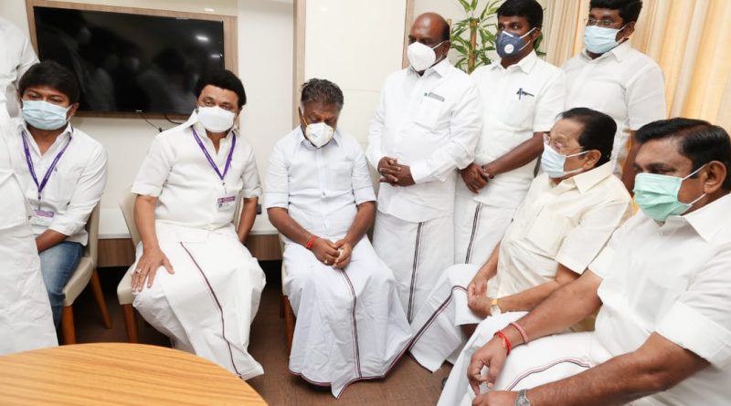 அஞ்சலி செலுத்திய பின், மனைவியை இழந்து வாடும் ஓ.பன்னீர்செல்வத்துக்கு முதலமைச்சர் மு.க.ஸ்டாலின் ஆறுதல் கூறினார்.