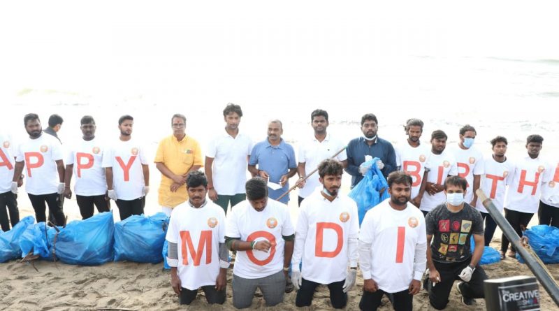 பிரதமர் நரேந்திர மோடியின் 71வது பிறந்தநாளை முன்னிட்டு தமிழ்நாடு பாஜக சார்பில் பல்வேறு நிகழ்ச்சிகளுக்கு நடத்த ஏற்பாடு செய்யப்பட்டுள்ளது. அதன் ஒரு பகுதியாக சென்னை பெசன்ட் நகர் கடற்கரையை தூய்மைப்படுத்தும் பணி நடைபெற்றது.