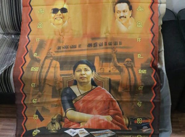 முந்தானையில் முழு உருவப்படம் கனிமொழி படத்துடன் கலக்கும் புடவை பிறந்தநாள் கிப்ட்
